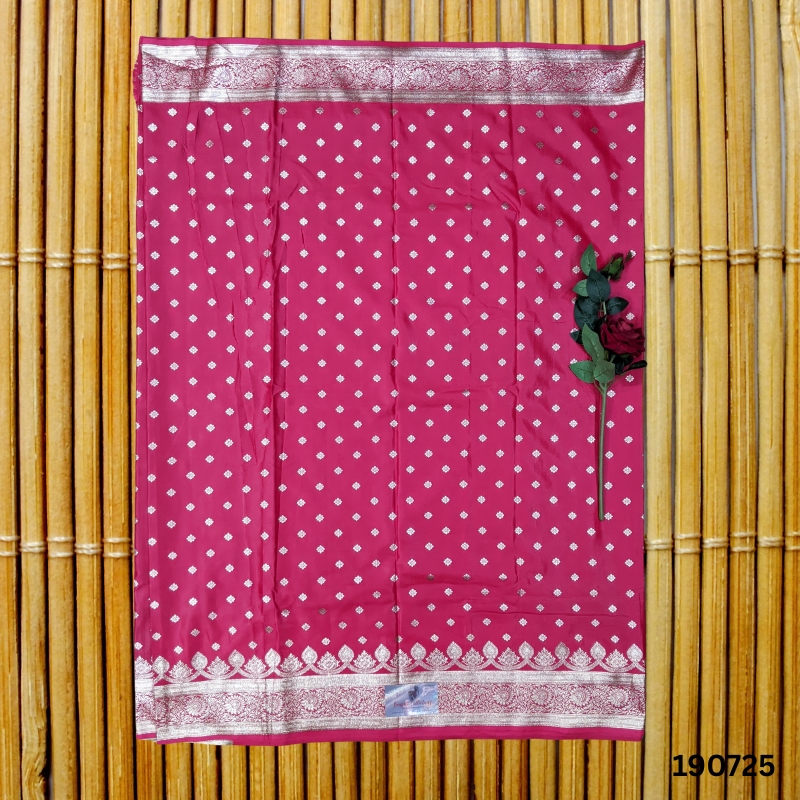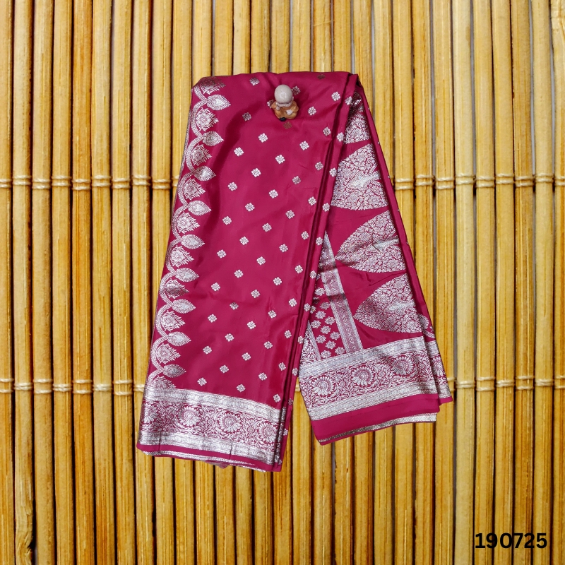 The saree boasts intricate Banarasi weaving with ornate patterns across the pallu and borders, exuding an air of regal tradition. The vibrant pink color, adorned with shimmering silver Zari motifs, reflects luxury and elevates your ethnic style for weddings, festivals, or special gatherings.